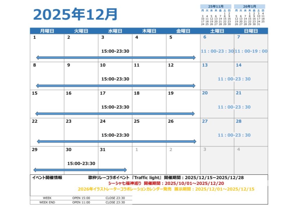 12月の営業日は変則的となっておりますので、ご来店の際は営業日時をご確認していただきますようお願いいたします。